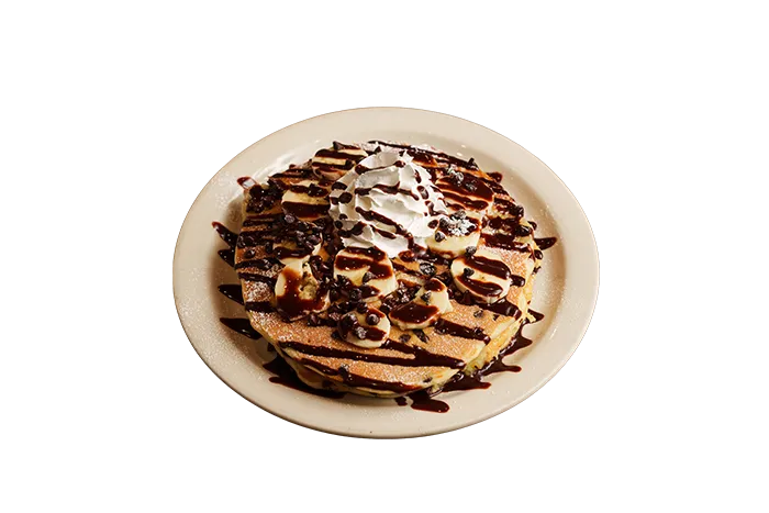 Bananas and Chocolate chips cooked into two buttermilk pancakes.