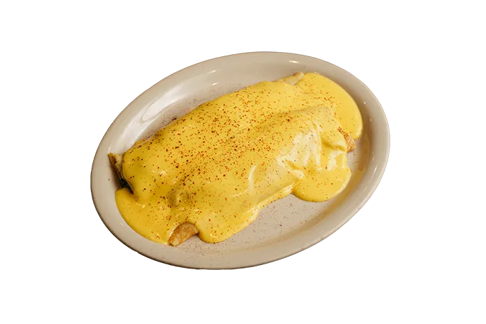 Grilled Chicken, Spinach, Mushrooms, Onions, Tomatoes and Swiss Cheese rolled up in 2 Crepes topped with Hollandaise Sauce.
