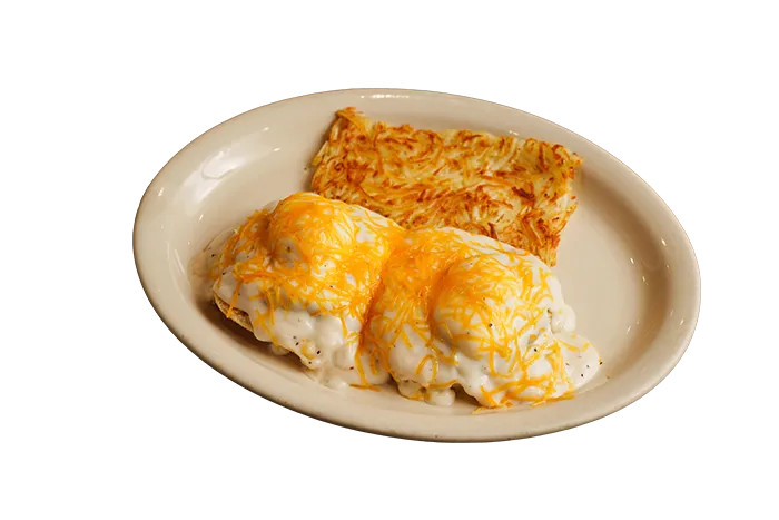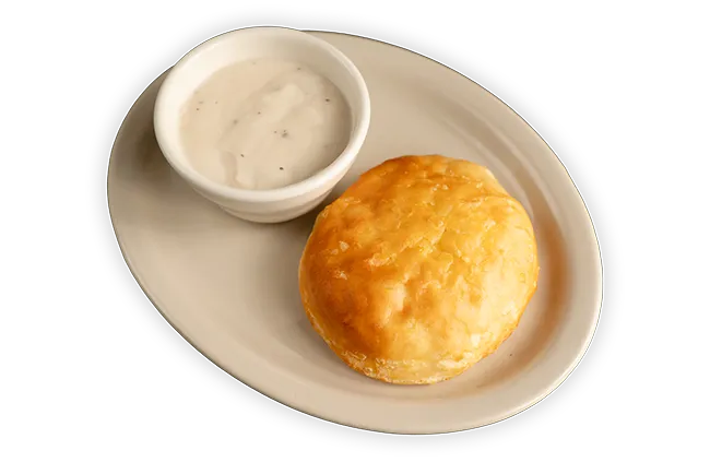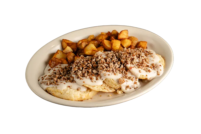 Sausage Gravy over 2 halved Biscuit served with Fried Potatoes and Fruit. Add 2 eggs for $2.