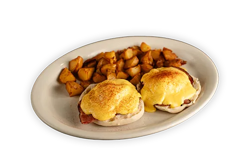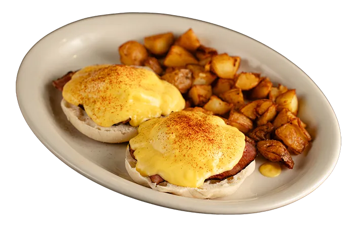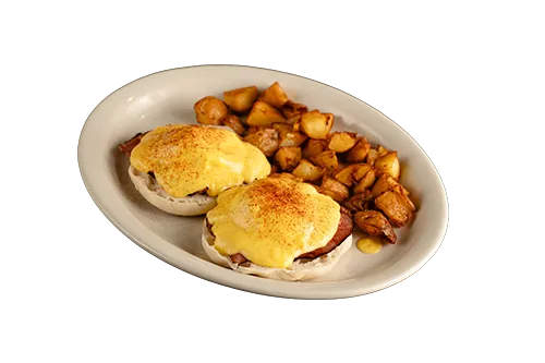 English muffin and Canadian bacon, topped with hollandaise sauce.