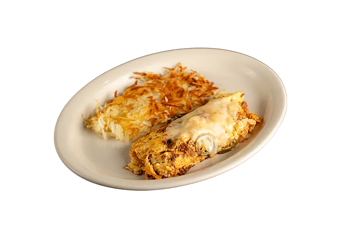 Eggs, Shredded Beef, Onions, Tomatoes and Jalapenos scrambled and topped with Cheddar and Monterey Jack Cheese served with a side of Hash Browns and Flour Tortillas.