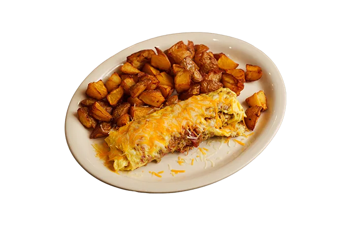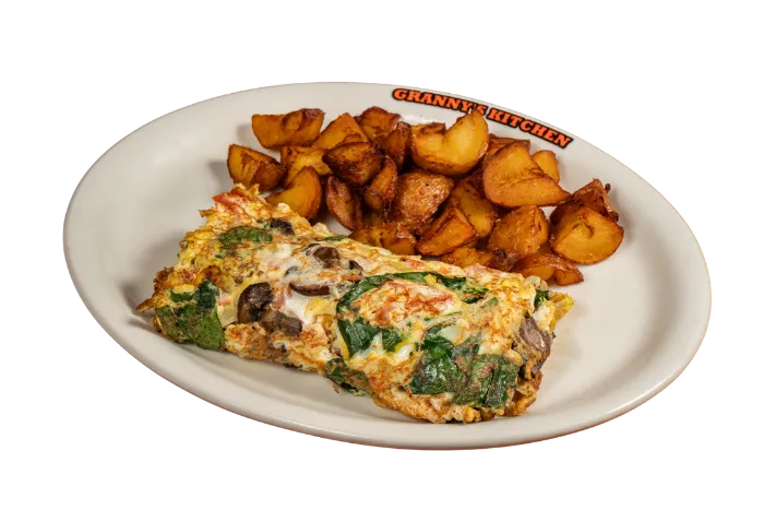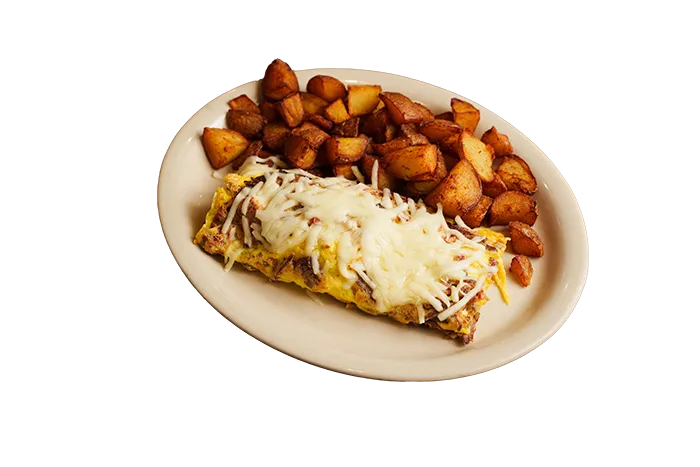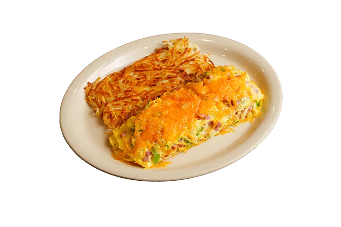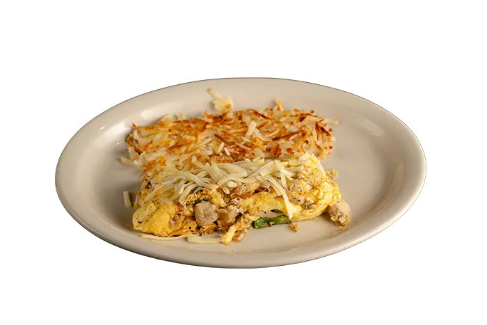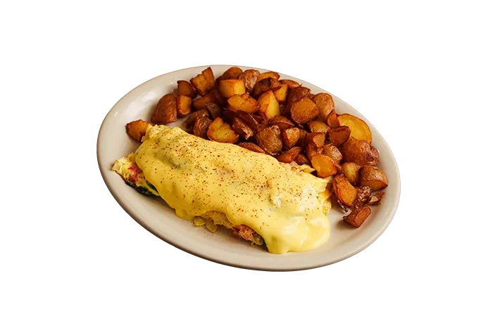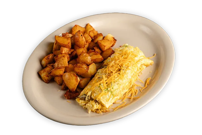 All omelets are made with freshly cracked eggs and served with your choice of side, plus toast, pancakes, or a biscuit. Substitute egg whites for 99¢.