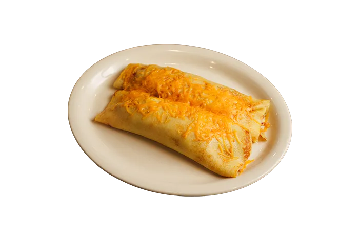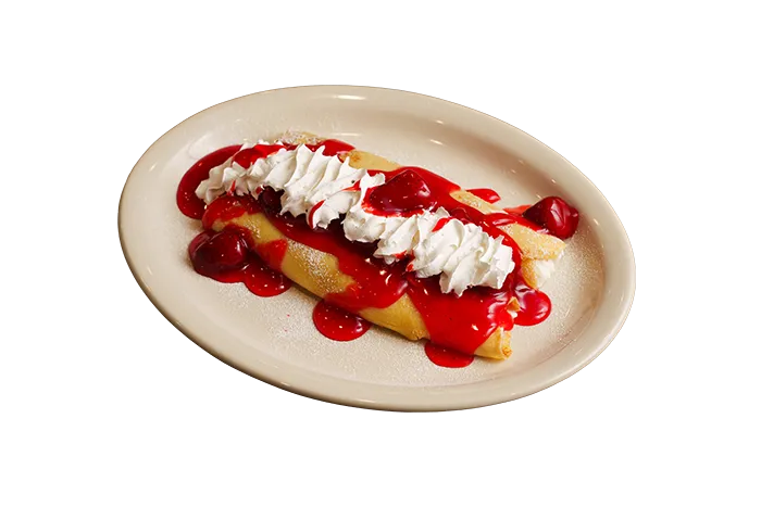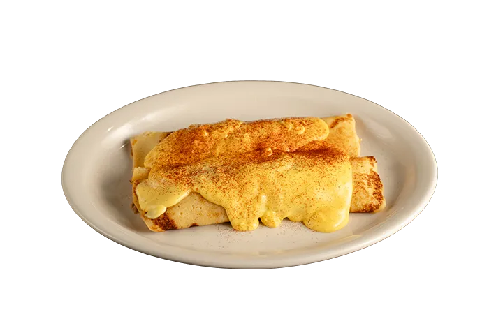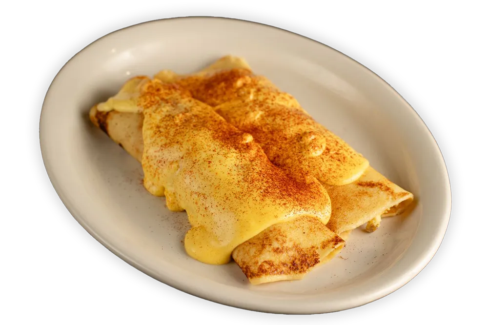 Eggs, Cheddar Cheese and your choice of Bacon, Sausage or Ham wrapped in 2 Crepes topped with Cheddar Cheese.