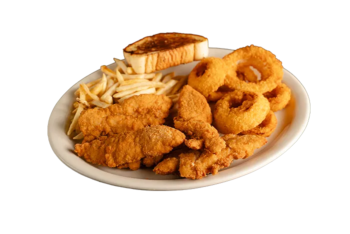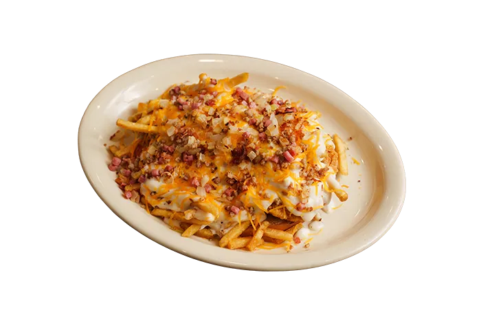 Two Chicken Fried Chicken served over Texas Toast topped with French Fries, Gravy, Onions, Bacon, Ham, Sausage Crumbles and Cheddar Cheese.