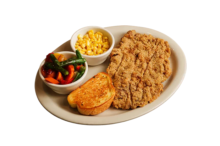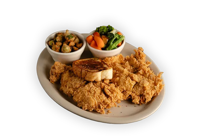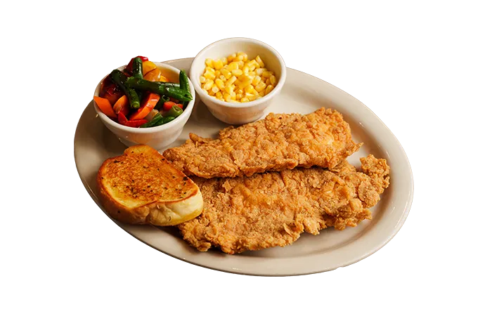 Two hand-breaded chicken breasts, fried until golden and crispy. Served with white gravy on the side.