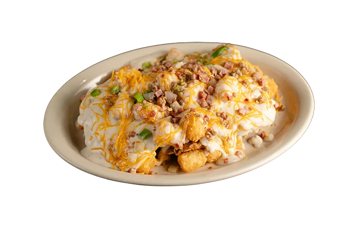 Chicken Fried Steak served over a halved Biscuit topped with Tater Tots, Gravy, Bacon, Ham, Sausage Crumbles, and Cheddar Cheese.