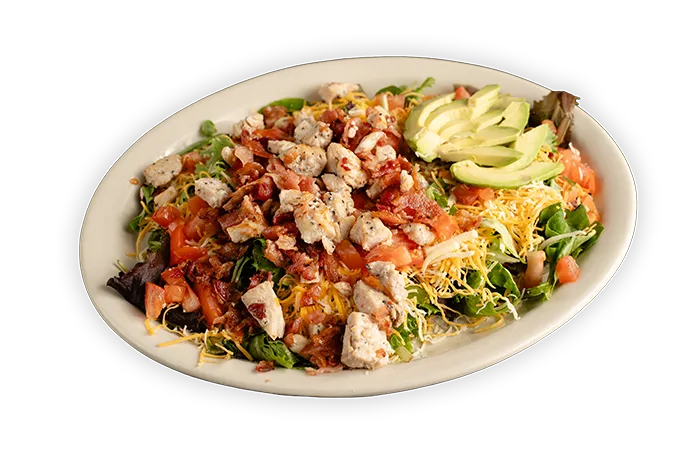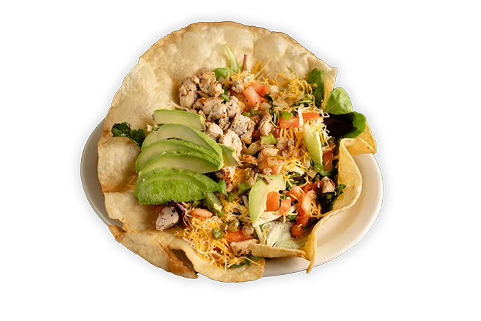 Topped with grilled chicken, avocado, onions, bell peppers, tomatoes, Monterey jack and cheddar cheese served in a crispy flour tortilla bowl and a side of salsa and sour cream.