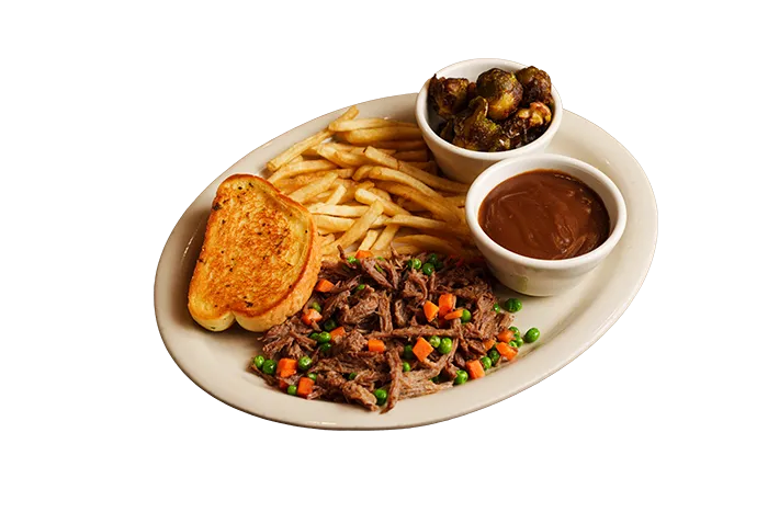 Tender hand-pulled pot roast with peas and carrots served with savory brown gravy and lunch bread.