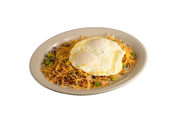 2 Eggs, cooked in your choice served over Cheddar and Monterey Jack Cheese, Onions, Bell Peppers, Mushrooms and Fried Potatoes served with a choice of 3 Bacon Strips, 3 Sausage Links or 2 Sausage Patties with a side of Toast, Biscuit or Pancakes.