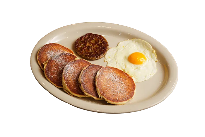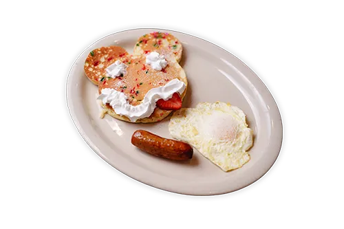 A Pancake dressed to make you smile served with an Egg of your choice and Bacon or Sausage Link.
