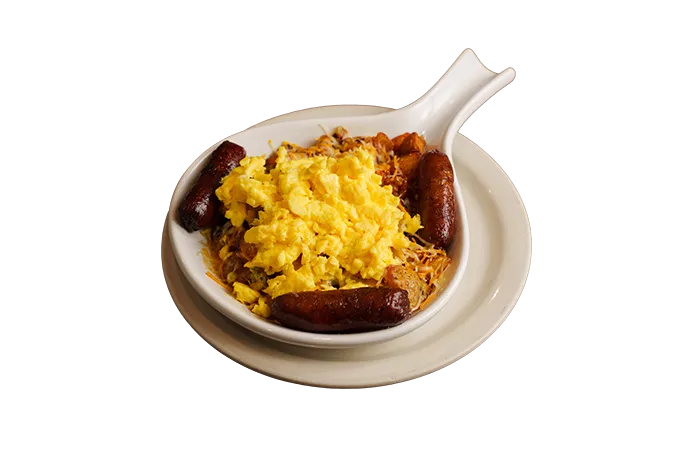 2 Eggs, cooked in your choice served over Cheddar, Onions, Bell Peppers, Sausage Crumbles and Hash Browns with a side of Toast, Biscuit or Pancakes.
