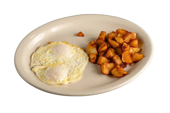 Two eggs your way, served with your choice of potatoes and breakfast bread.