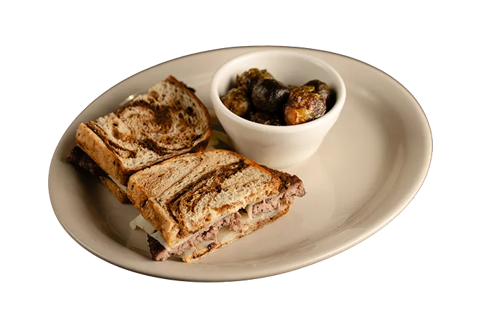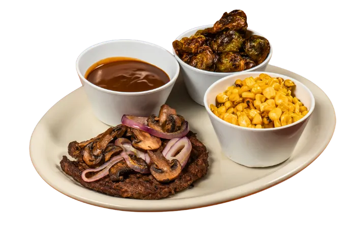 Flame-grilled ground sirloin patty, seasoned and seared just right topped with grilled onions and mushroom served with side of brown gravy and lunch bread.