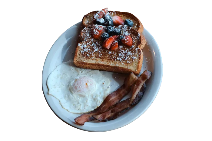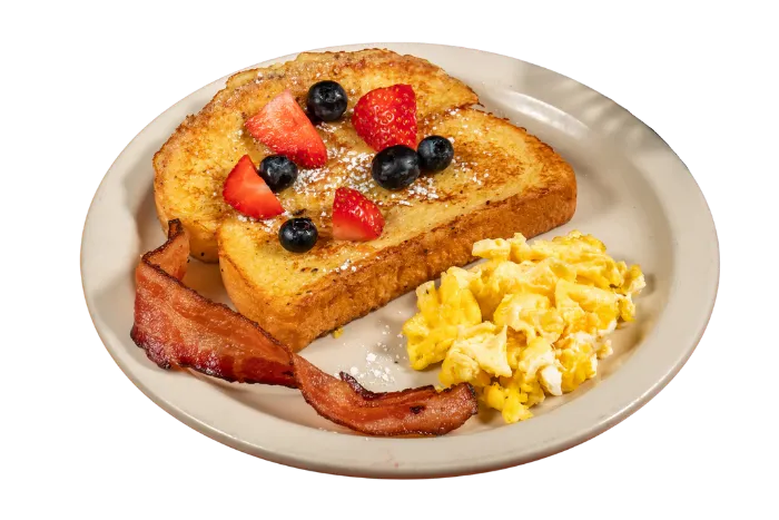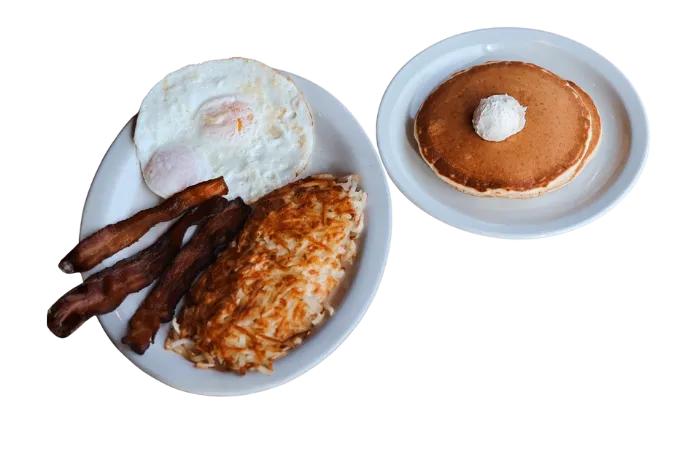 One egg any style, your choice of 2 bacon strips, 2 sausage links, or 1 sausage patty. Comes with hash browns, fried potatoes, fruit, or cottage cheese, plus your choice of toast, pancakes, or fresh-cut fruit.