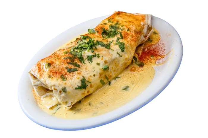Eggs, Ground Beef, Onions, Bell Peppers and Hash Brown mixed and rolled with Cheddar Cheese in a Flour Tortilla.