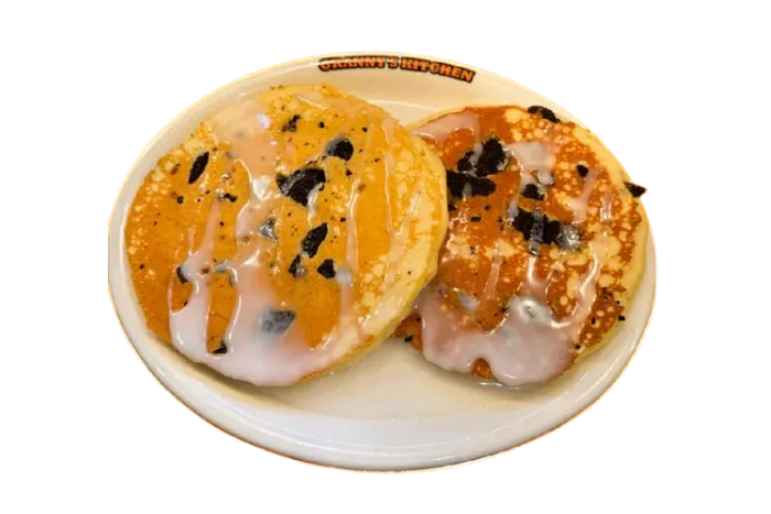 Oreo Crumbles cooked into two Buttermilk pancakes.
