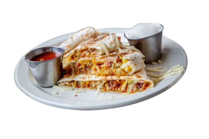 Eggs, Bacon, Ham, Sausage, Hash Browns and Monterey Jack Cheese folded and grilled in Flour Tortilla.