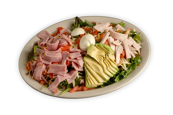 Deli turkey, diced ham, tomatoes, Monterey jack and cheddar cheese served with a hardboiled egg.
