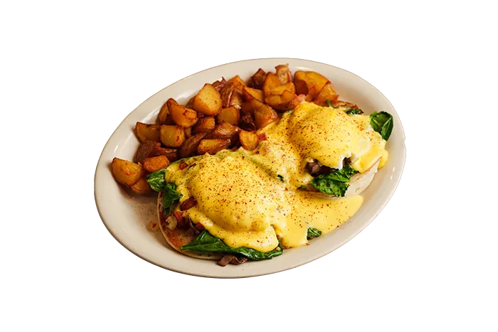 English muffin, spinach, tomatoes, mushrooms, and onions, topped with hollandaise sauce.
