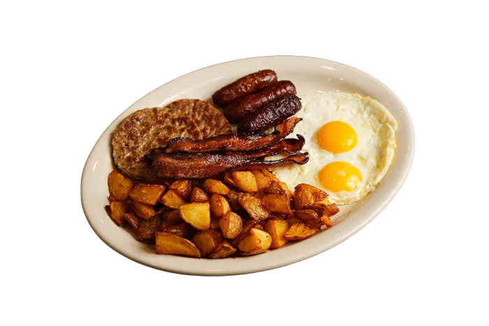 Two eggs, a potato side, breakfast bread choice, and your choice of three meats: bacon, sausage patties, sausage links, or sampler ham. Turkey options available.
