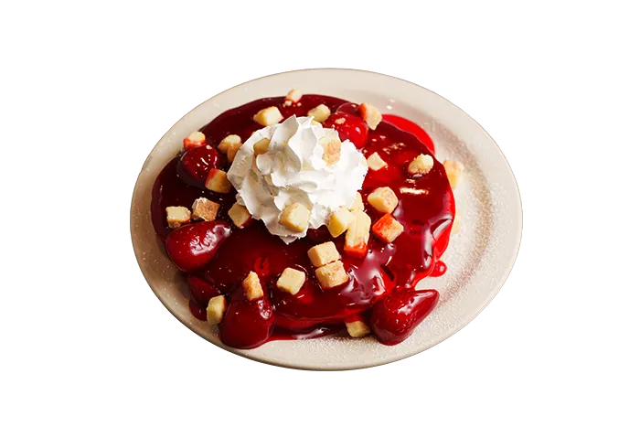 Cheesecake bites cooked into two Buttermilk Pancakes and topped with Strawberries.