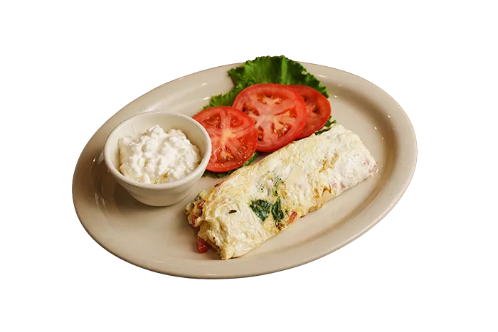 Fluffy egg whites whipped with spinach, onions, and tomatoes. Served with sliced tomatoes and cottage cheese.