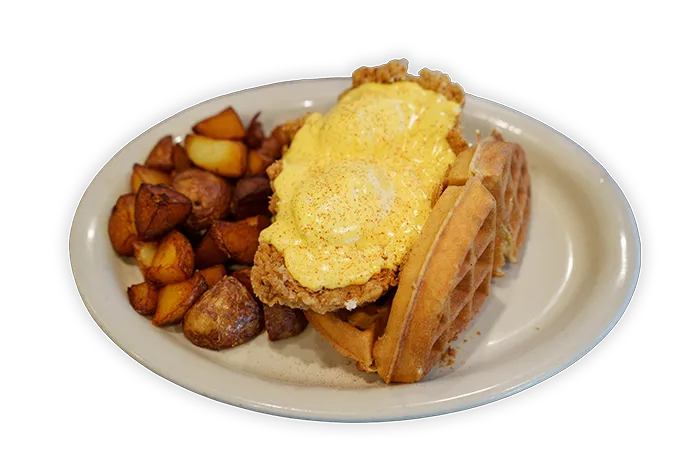 Crispy waffle and a hand-breaded fried chicken breast, topped with hollandaise sauce.