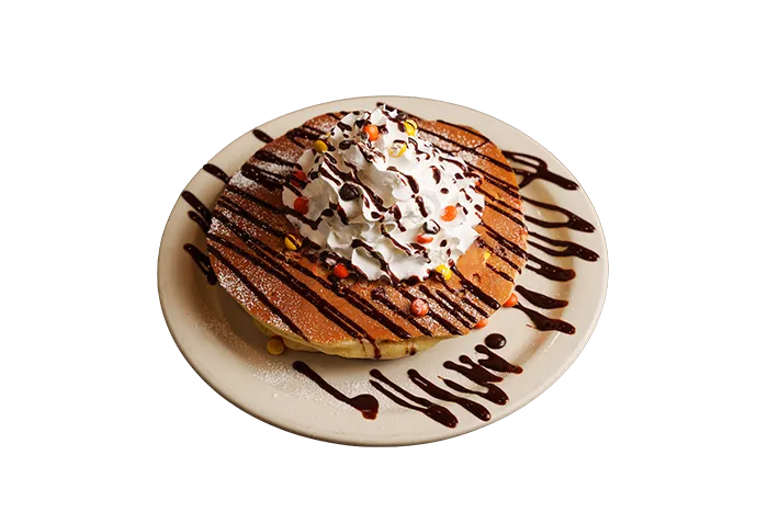 Reese’s Pieces cooked into two Buttermilk Pancakes.