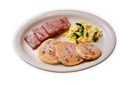2 Eggs whipped with Spinach served with 3 Rainbow Sprinkle Cakes and Ham.